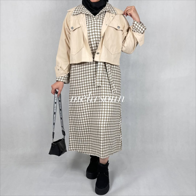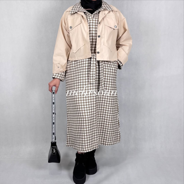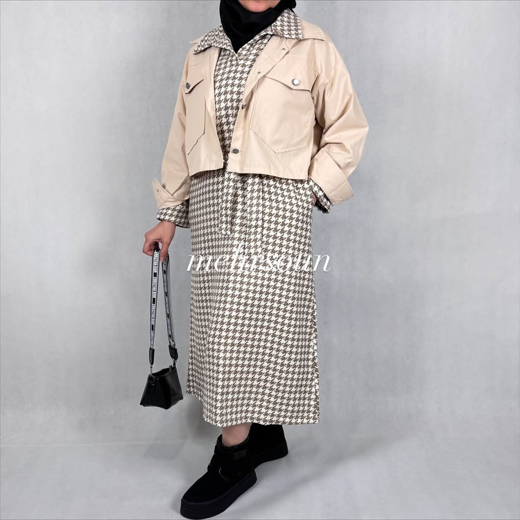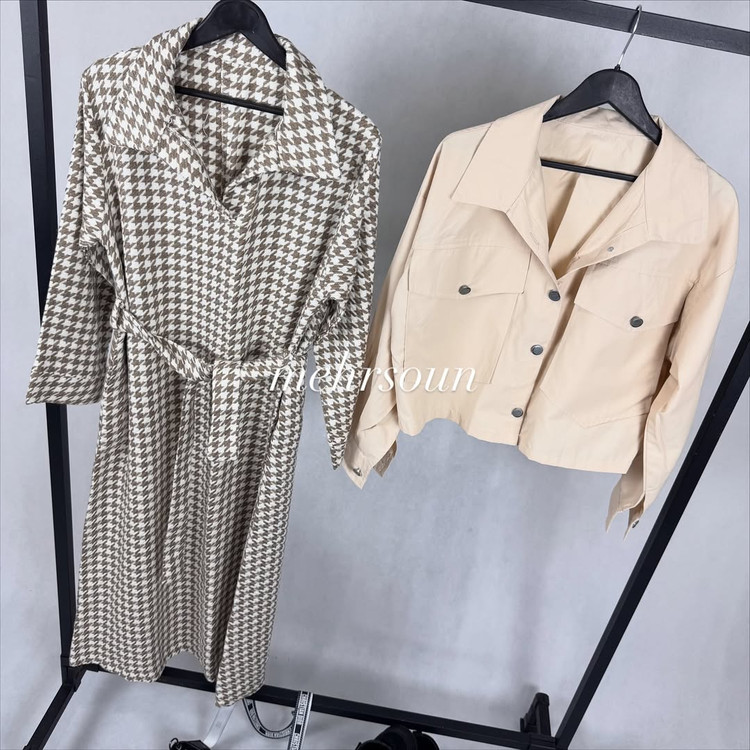 - طراحی ترکیبی: کفتان بلند با الگوی هوندستوث + کت کراپ ساختارمند با جیبهای دکمهدار