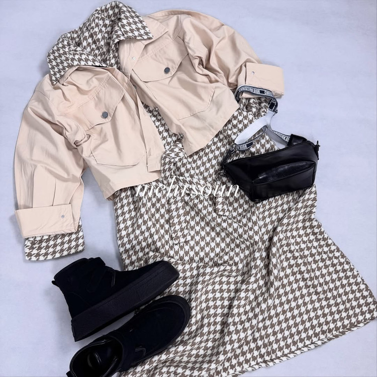 ترکیب متریال و فرم: کفتان بلند با الگوی هوندستوث مشکیسفید، همراه با کت کراپ ساختارمند که به بالاتنه فرم میدهد و استایل را متعادل میکند.