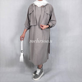 طراحی مینیمال و هماهنگ: ست بازل با ترکیب کت کوتاه و سارافون بلند، حس تعادل و آرامش بصری ایجاد میکند. رنگ طوسی خنثی، بهراحتی با آیتمهای دیگر ست میشود و برای استایلهای پاییزی عالیست.