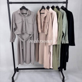 راحتی در پوشش: پارچه لطیف و آزاد سارافون، بدون چسبندگی به بدن، حس راحتی و آزادی حرکت را فراهم میکند. کت نیز با فرم آزاد و دکمهدار، بهخوبی روی سارافون مینشیند.