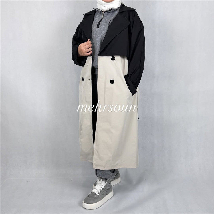 اگر بهدنبال یک بارانی بلند زنانه هستید که هم کاربردی باشد و هم ظاهری متفاوت به استایل پاییزیتان بدهد، این بارانی دو رنگ با بالاتنه مشکی و پایینتنه نود/بژ انتخابی ایدهآل است. طراحی دو دکمه (دابل برست)، یقه پهن و کمربند قابل تنظیم، فرم اندامی شیکی ایجاد میکند و با کفش کتانی، بوت یا نیمبوت بهراحتی ست میشود. پارچه مقاوم در برابر باد و رطوبت سبک، آن را به همراه همیشگی شما در هوای خنک پاییز و زمستان تبدیل میکند.