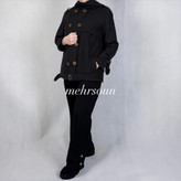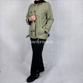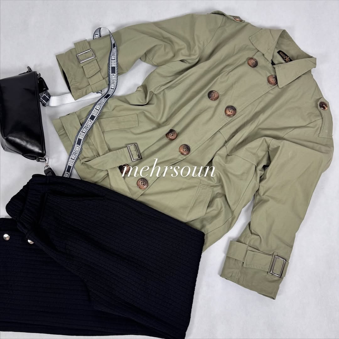 این بارونی با قد ۷۵ سانتیمتر، پوششی ایدهآل برای روزهای خنک پاییز فراهم میکند. دو ردیف دکمه قهوهای، یقه پهن و بندهای قابل تنظیم در کمر و سرآستین، همگی نشان از توجه به جزئیات و طراحی هوشمندانه دارند. ترکیب رنگ زیتونی با مشکی در آستینها، جلوهای خاص و متفاوت به این مدل بخشیده است.