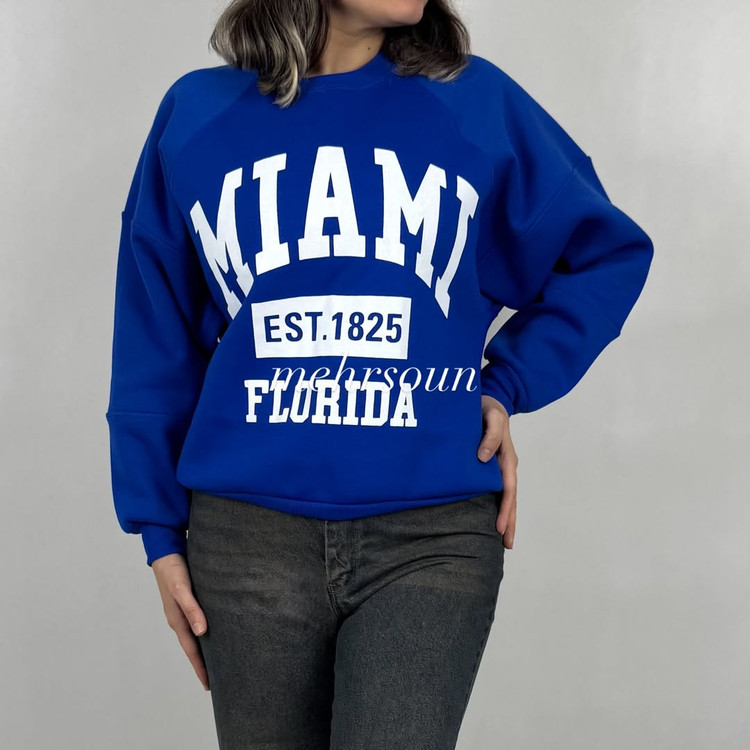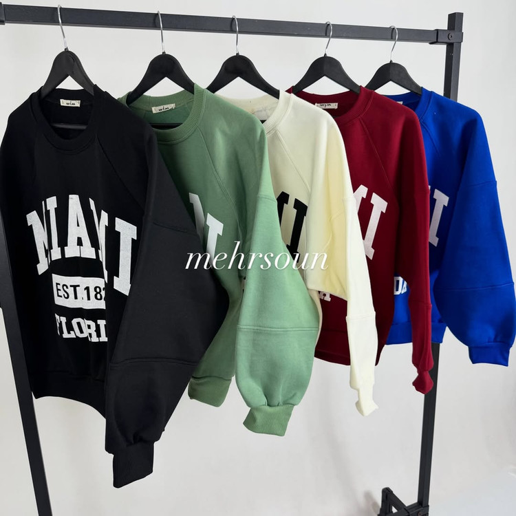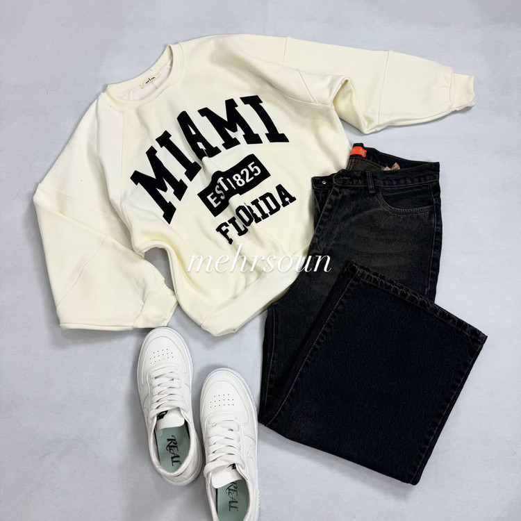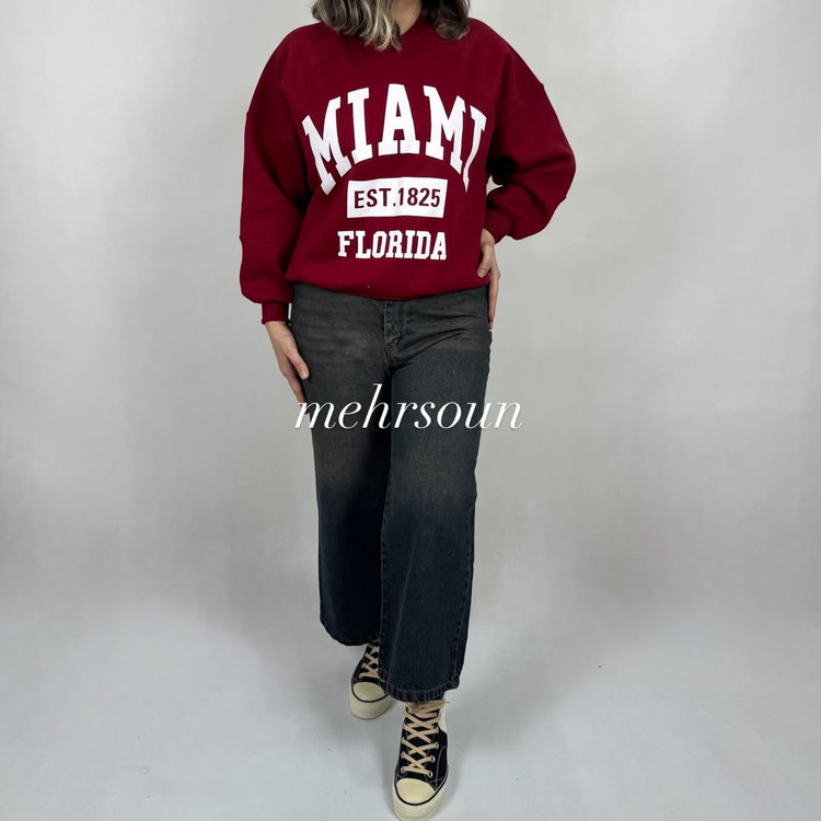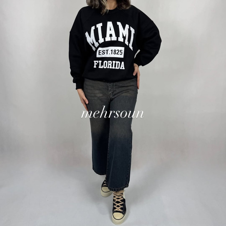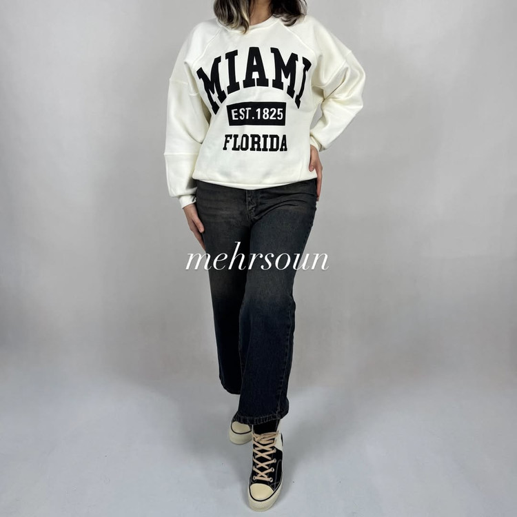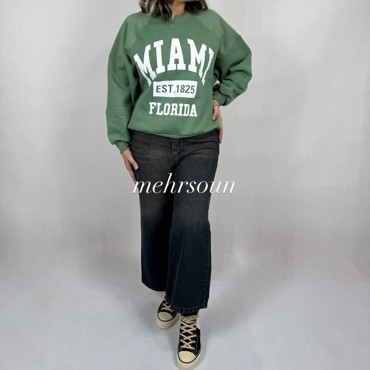 پولیور ساده میامی با چاپ سفید و تایپوگرافی مینیمال، انتخابی عالی برای استایل کژوال روزمره. قد کار ۷۰ سانت و فیت آزاد، مناسب شروع از سایز ۴۶. رنگبندی متنوع: مشکی، سبز، کرم، زرشکی و آبی.