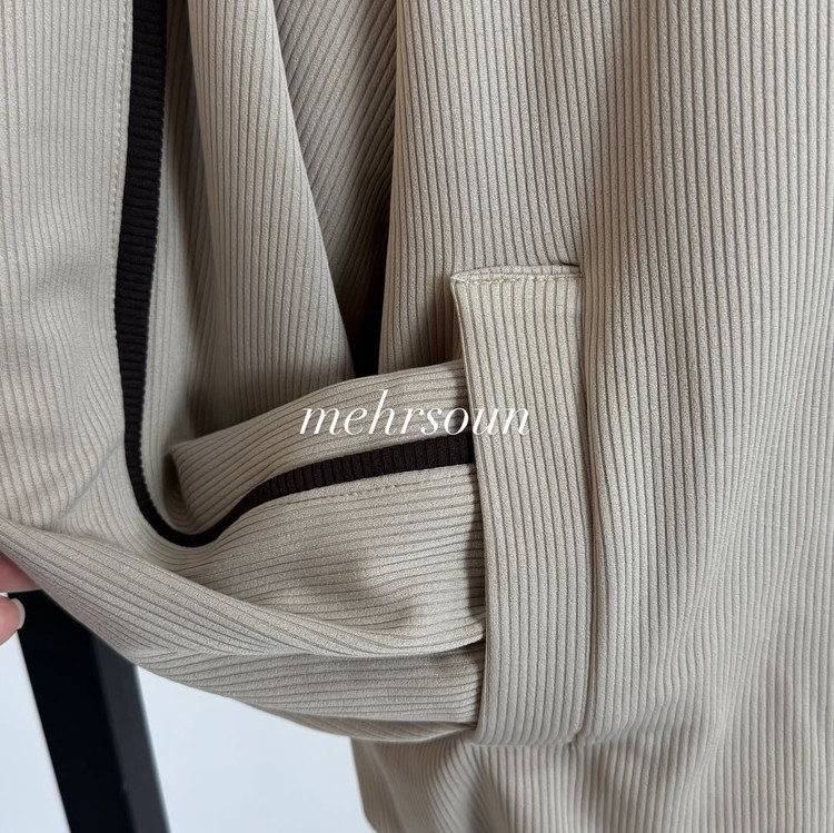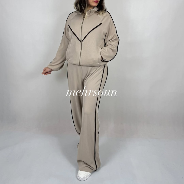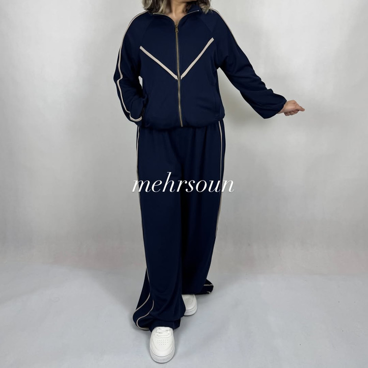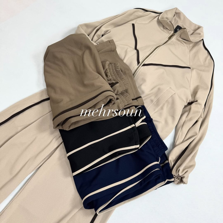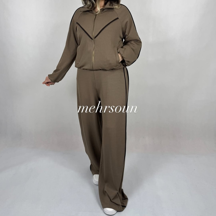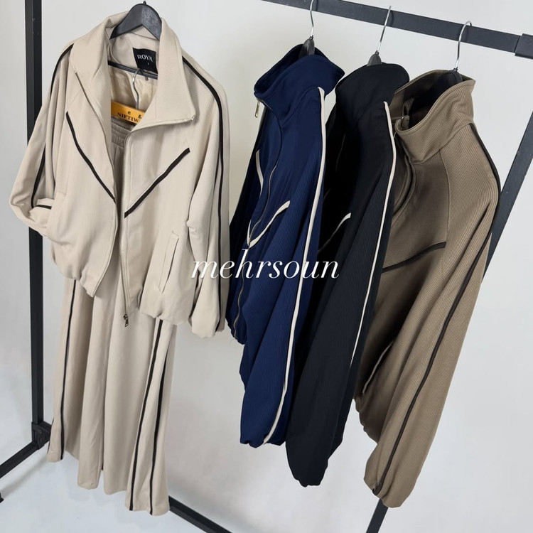 ست اسپرت–مینیمال با دیزاین خطوط لولهای (پایپینگ) کنتراست؛ کت زیپی و شلوار وایدلگ برای استایلهای روزمره تا استایل شهری شیک.