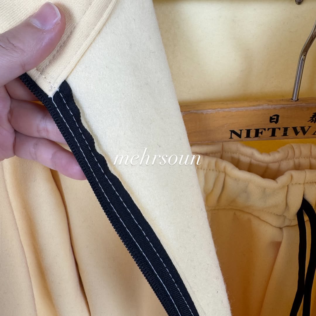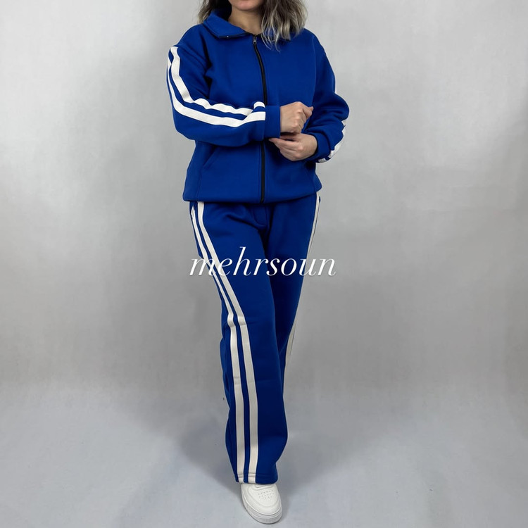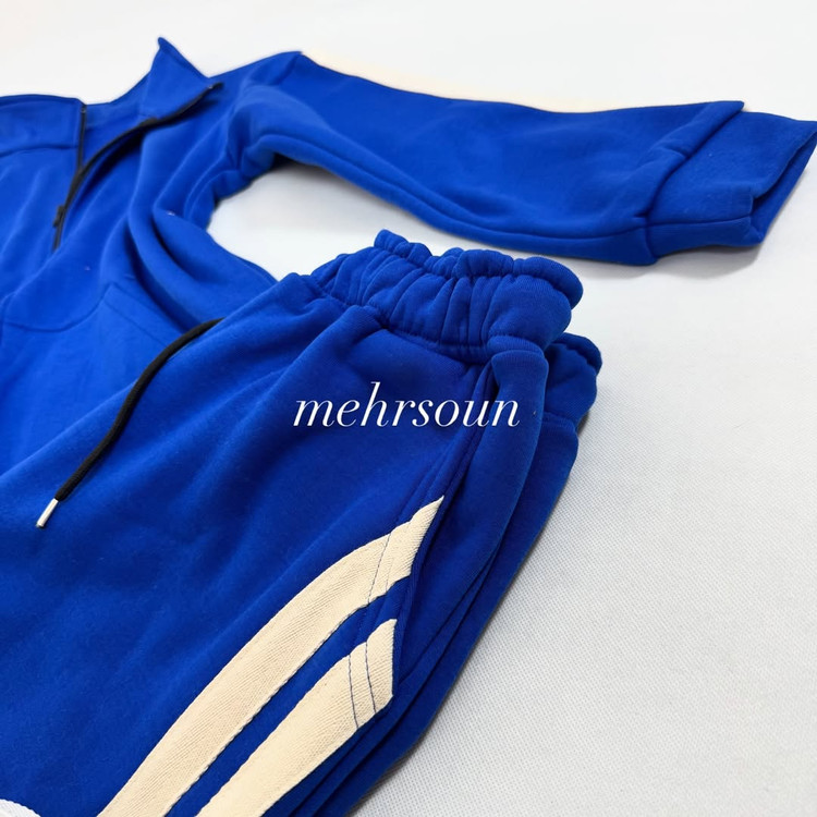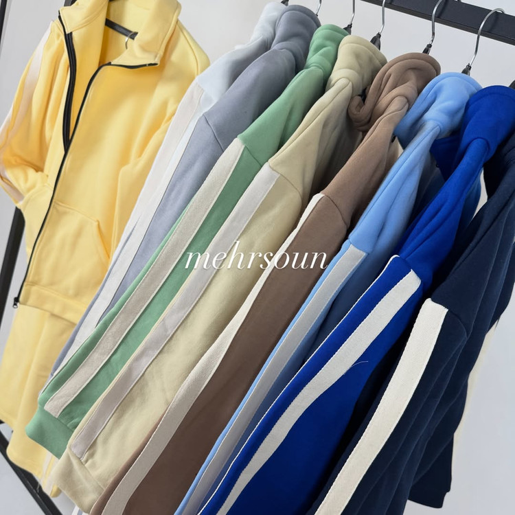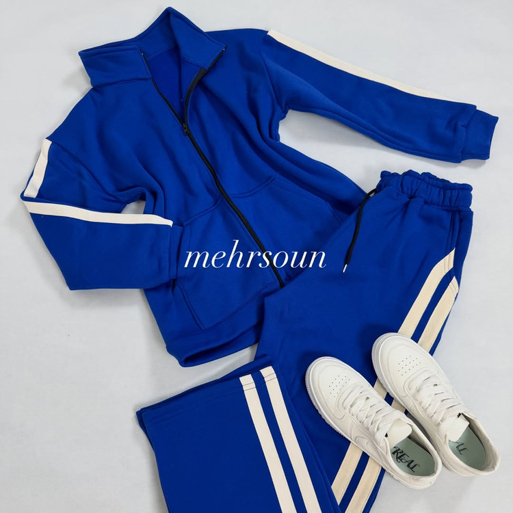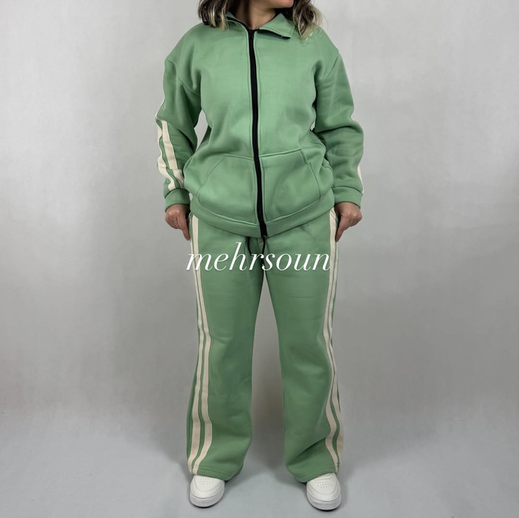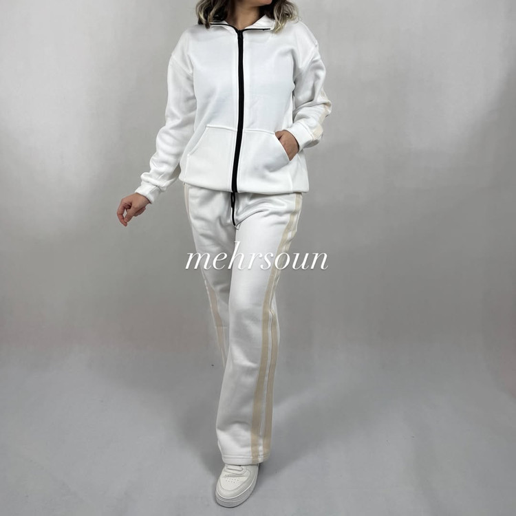 - طراحی: سویشرت زیپدار با یقه ایستاده و راهراه کناری هماهنگ با شلوار