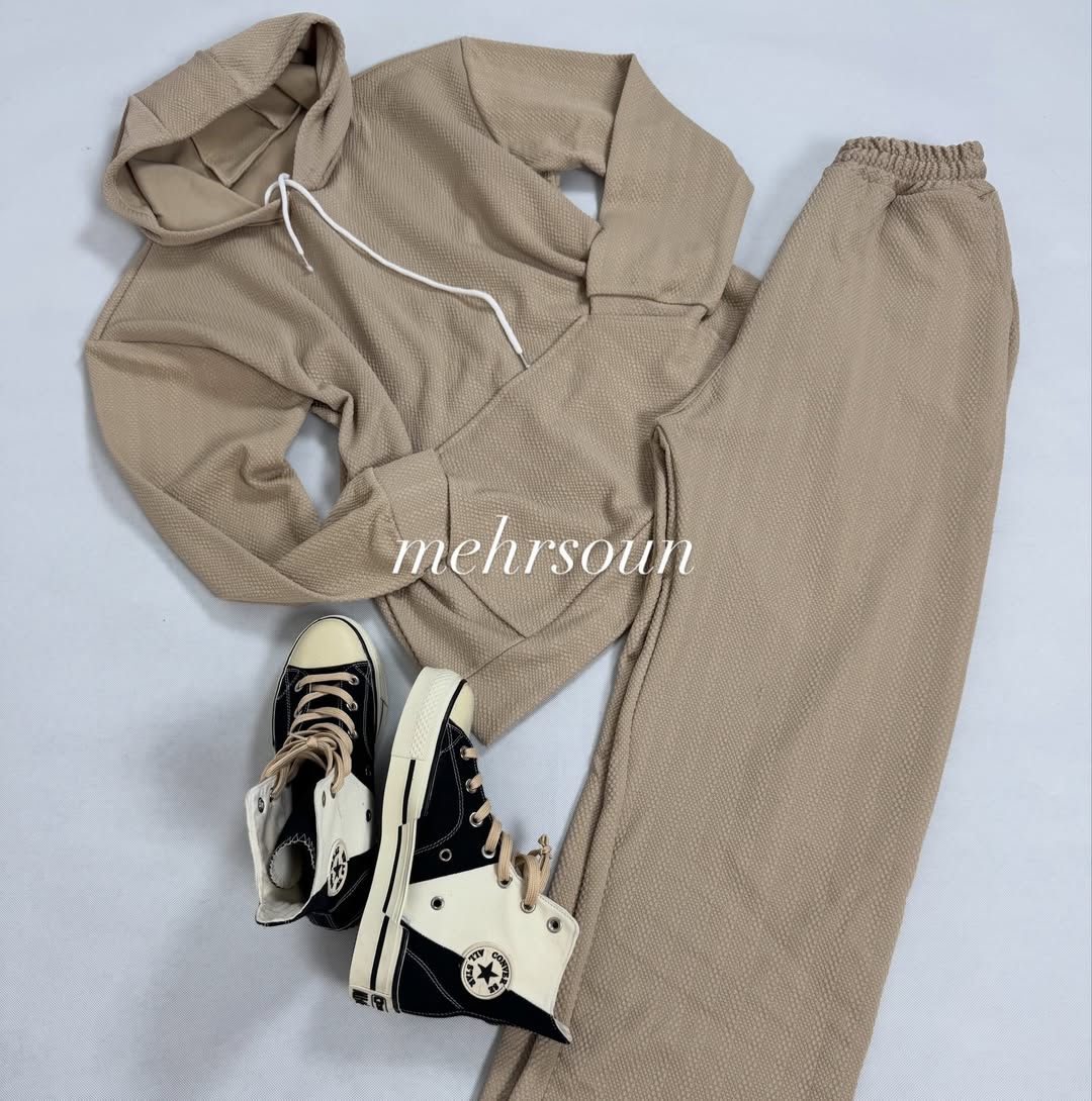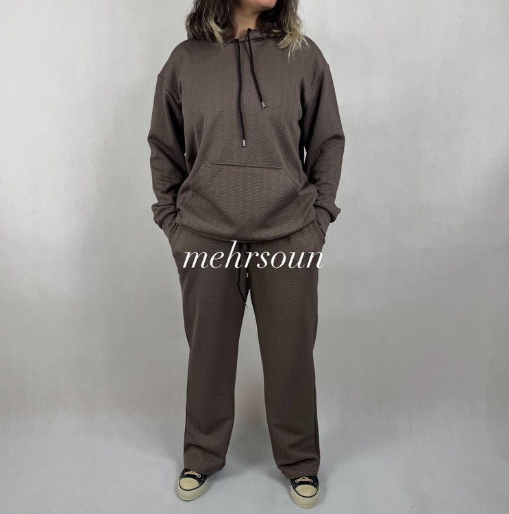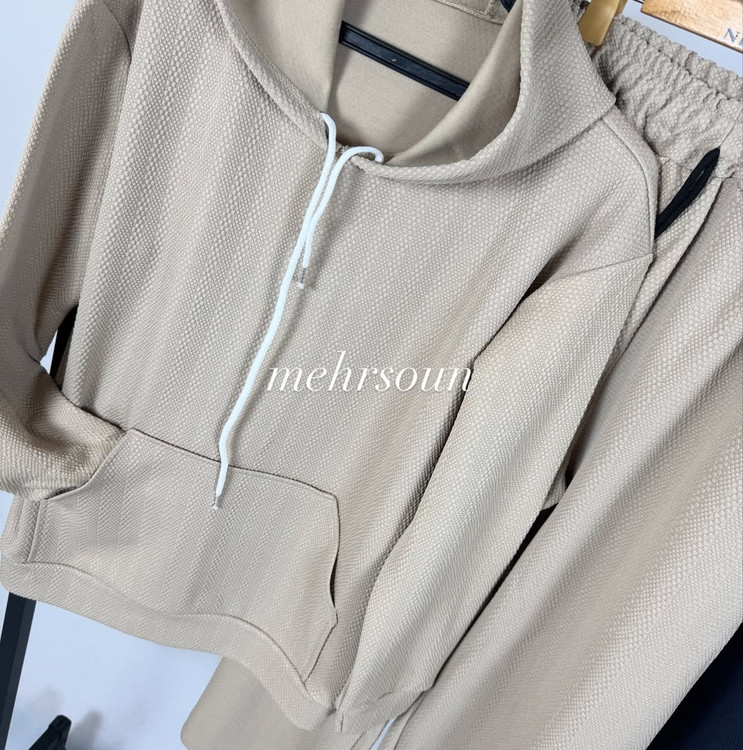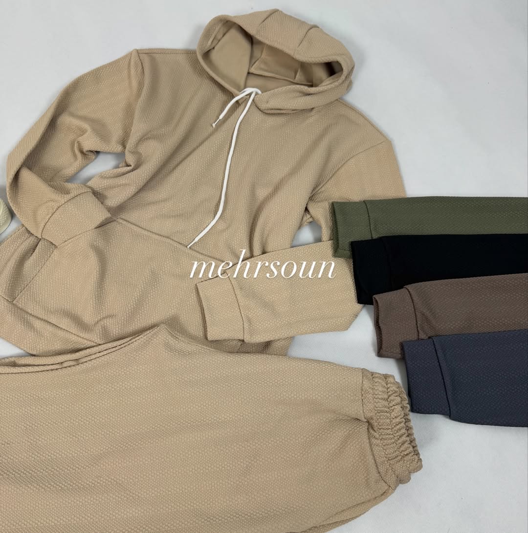 ست هودی و شلوار اسپرت با پارچه بافتدار (وافل/نیت)؛ گرم، لطیف و بادوام برای استفاده روزانه، باشگاه و سفر. طراحی مینیمال، آزاد و شیک؛ مناسب پاییز و زمستان. در رنگهای خنثی و ترند. کالکشن «mehrsoun».