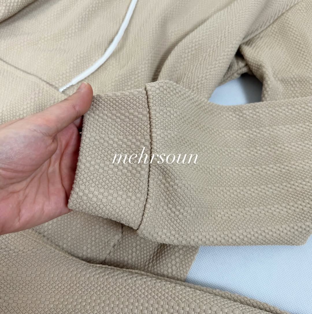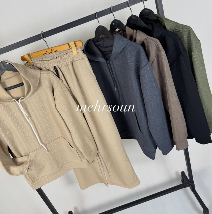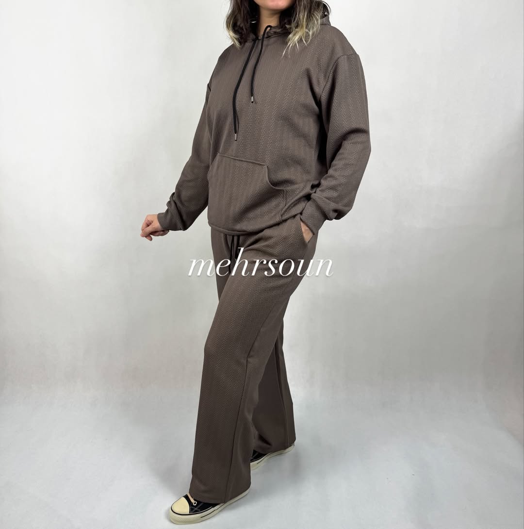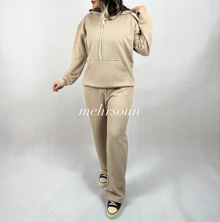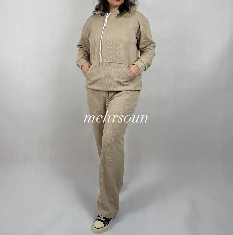 ست هودی و شلوار اسپرت با پارچه بافتدار (وافل/نیت)؛ گرم، لطیف و بادوام برای استفاده روزانه، باشگاه و سفر. طراحی مینیمال، آزاد و شیک؛ مناسب پاییز و زمستان. در رنگهای خنثی و ترند. کالکشن «mehrsoun».