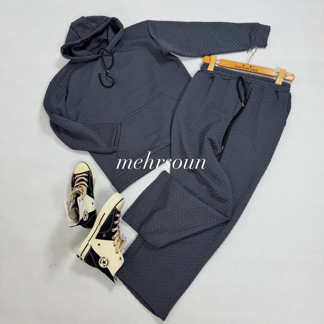 - جزئیات طراحی: هودی با جیب کانگورویی و بند کلاه، شلوار با جیبهای جانبی