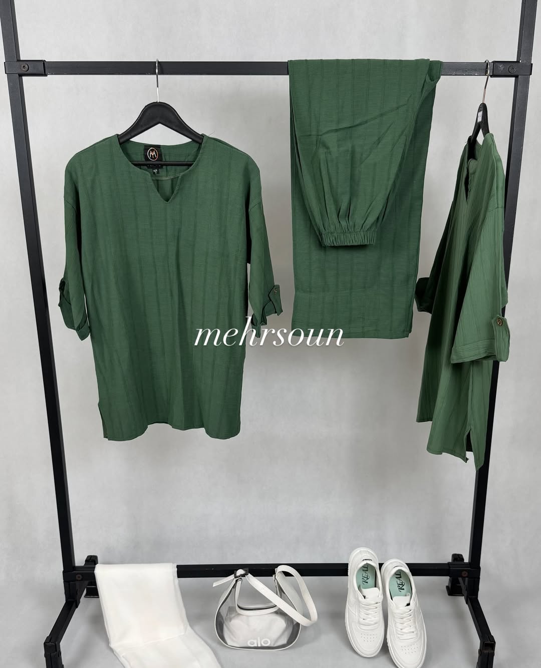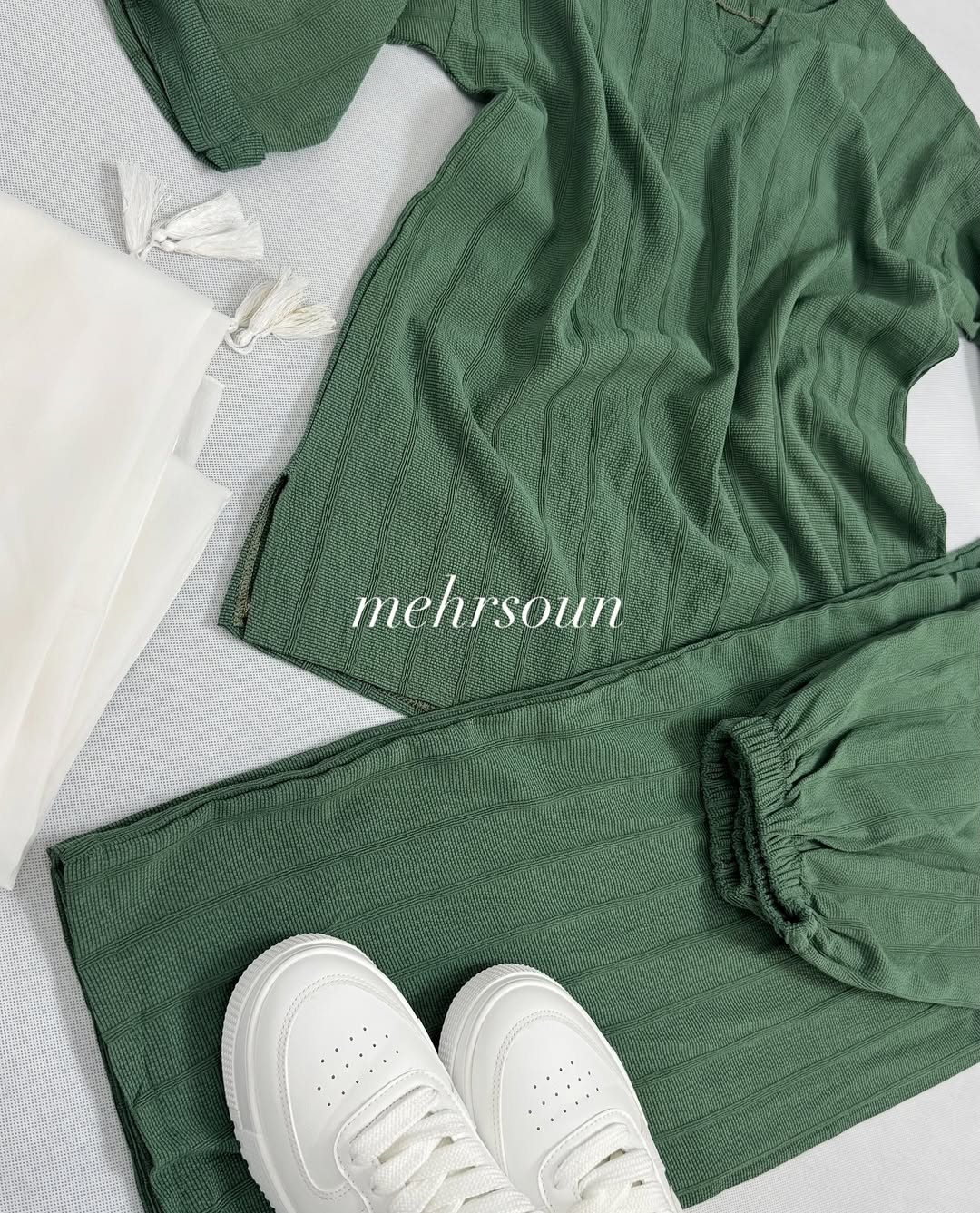 ✔ قابل ست با شال یا روسری سفید، کرم، مشکی و رنگهای خنثی
