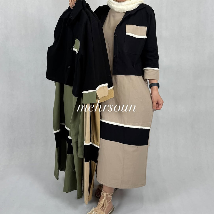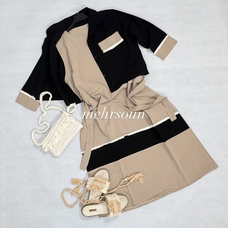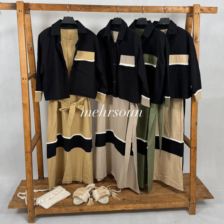 ترکیب رنگبندی پارچه ها،سارافون ساده همراه کت جلو باز و جیب دار
