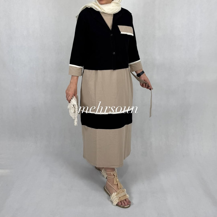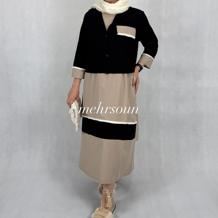 طراحی: سارافون ساده با ترکیب رنگی مشکی و کرم + کت جلو دکمهای با جیب تزیینی