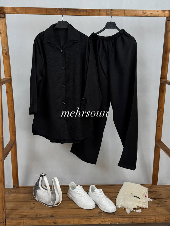 ✔️ مدل: شامل شومیز دکمهدار جلو باز و شلوار ساده و آزاد.