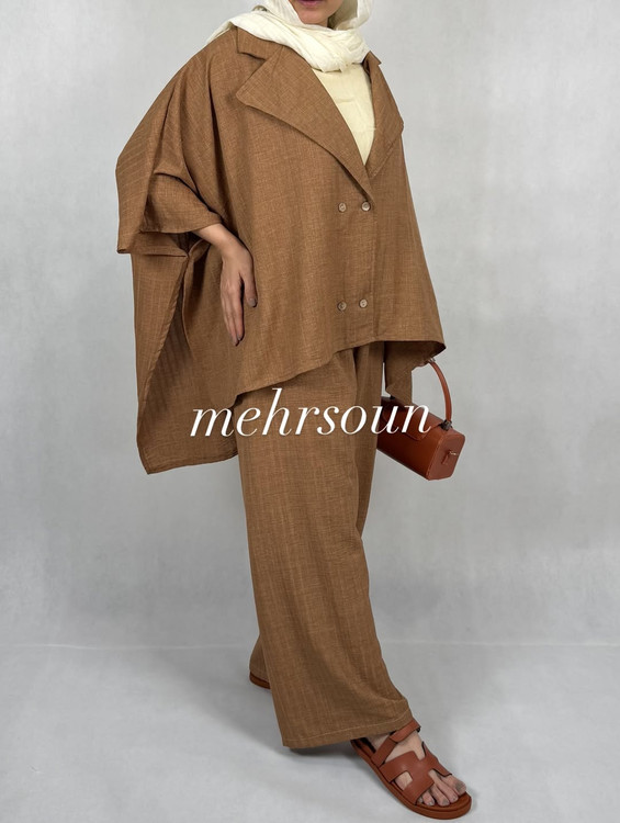 ست جذاب مانتو پانچی و شلوار بگ،شانتون طرح دار،مانتو پانچی یقه انگلیسی