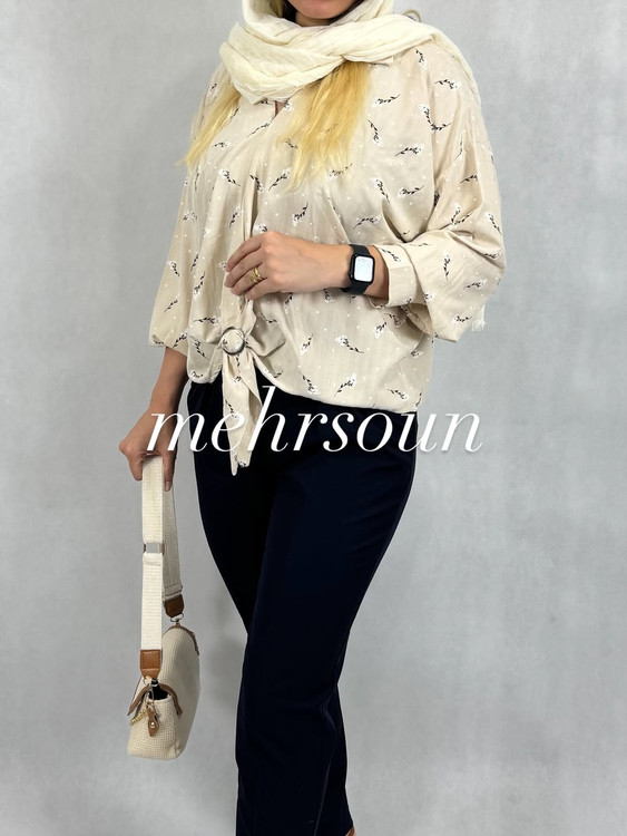 پارچه نخ پنبه خنک و سبک، بهترین انتخاب برای روزهای گرم بهار و تابستان است و حس راحتی و لطافت را به شما هدیه میدهد. این شومیز با طرح گلگچی ریز و جذاب، به راحتی با شلوار یا دامن ست میشود و استایل روزانه یا مهمانیهای دوستانهتان را خاصتر میکند.