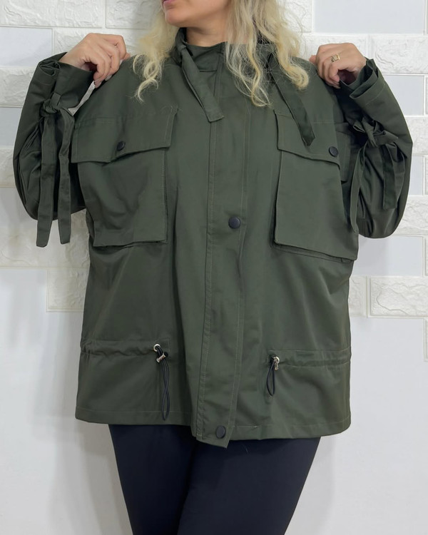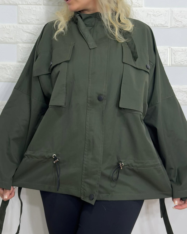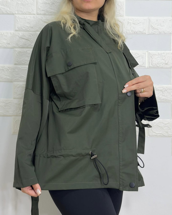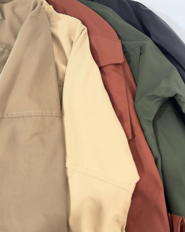 کمر بند دار و گت شونده،جیب های پاکتی بزرگ روی سینه،جلو زیپ و دکمه دار
