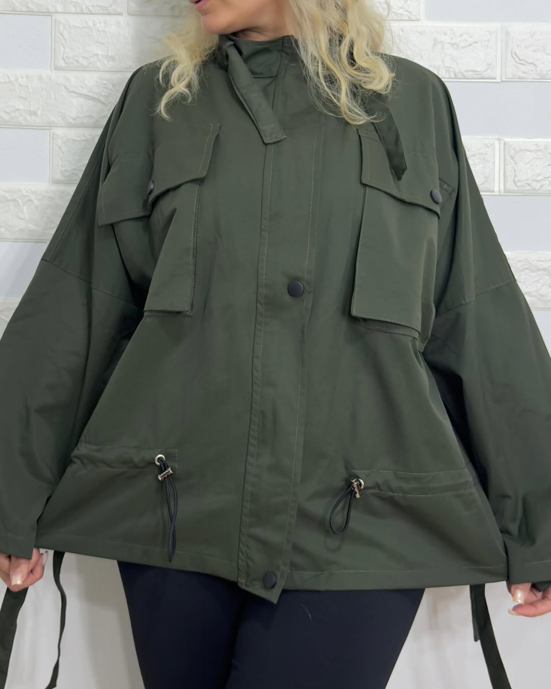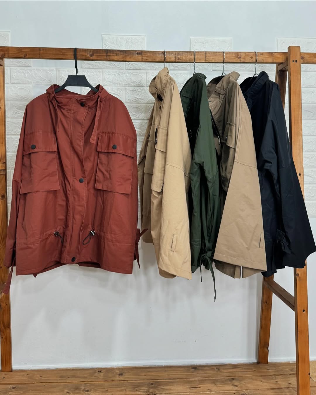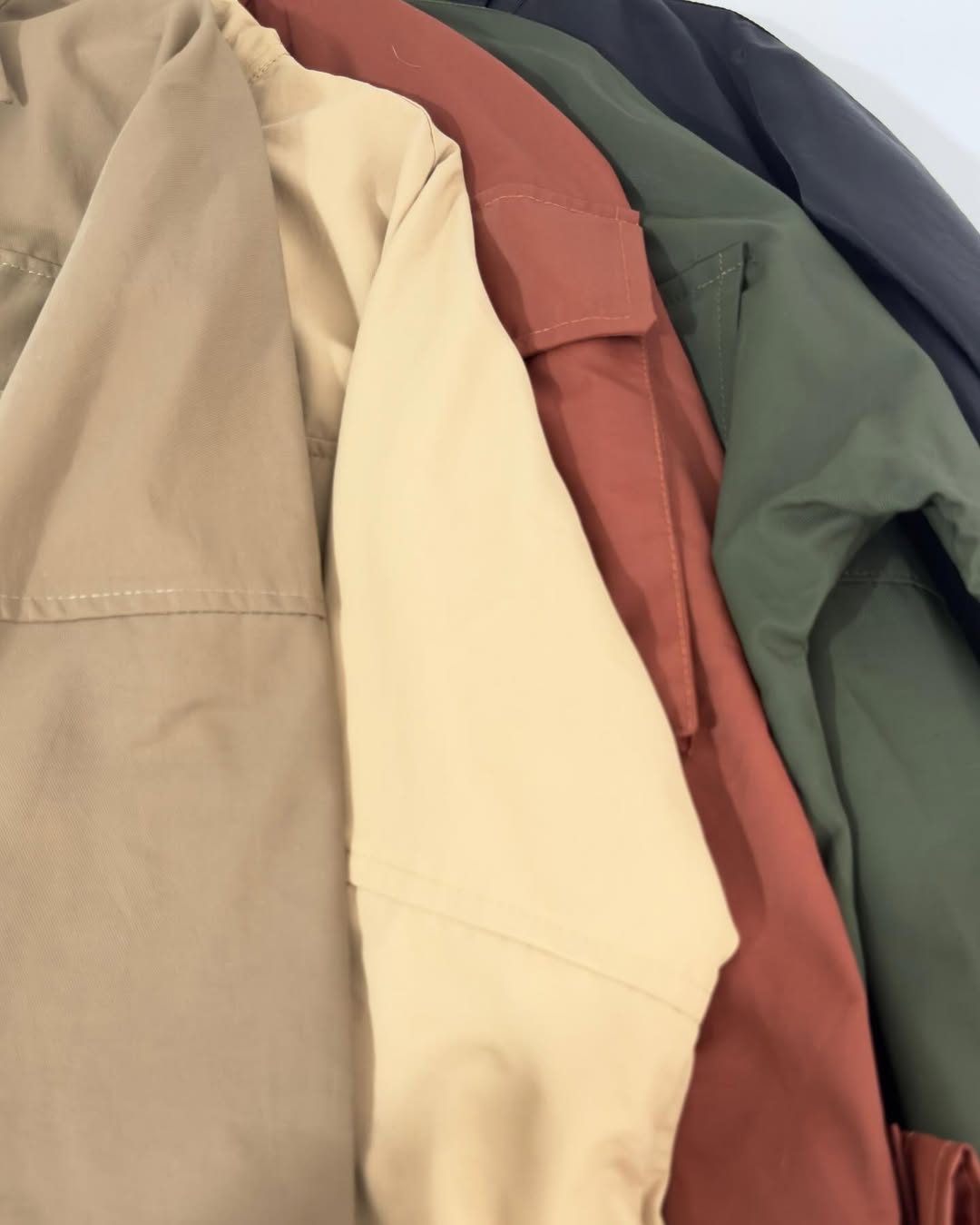 جزئیات : کمر بند دار و گت شونده،جیب های پاکتی بزرگ روی سینه،جلو زیپ و دکمه دار