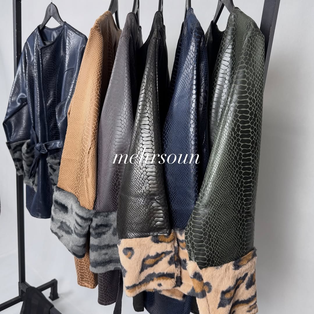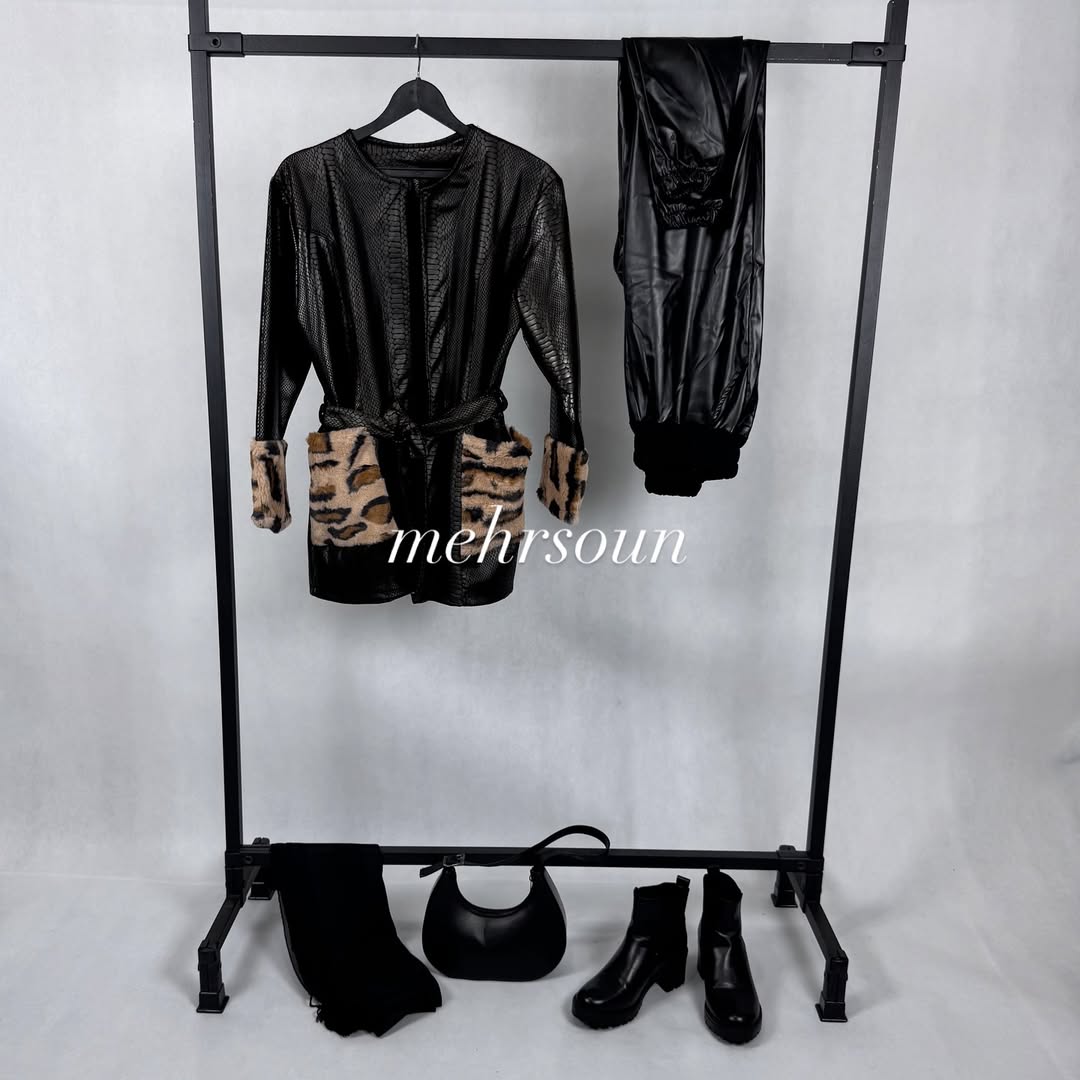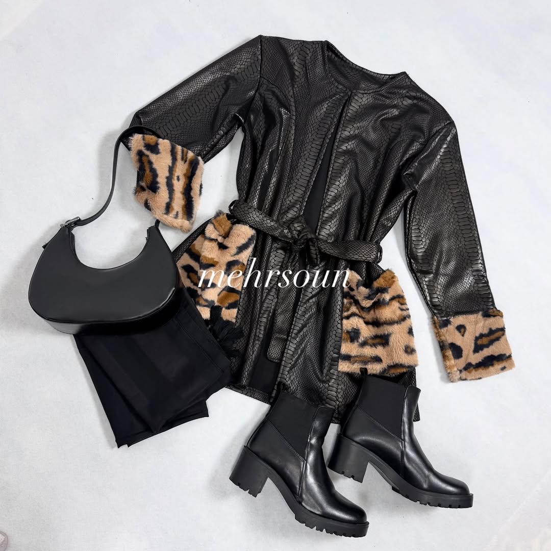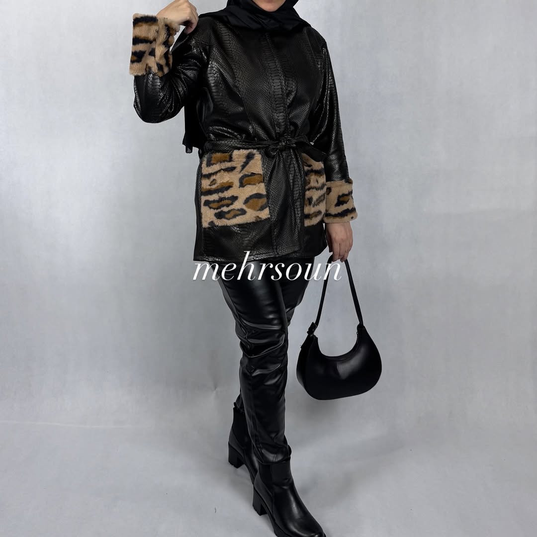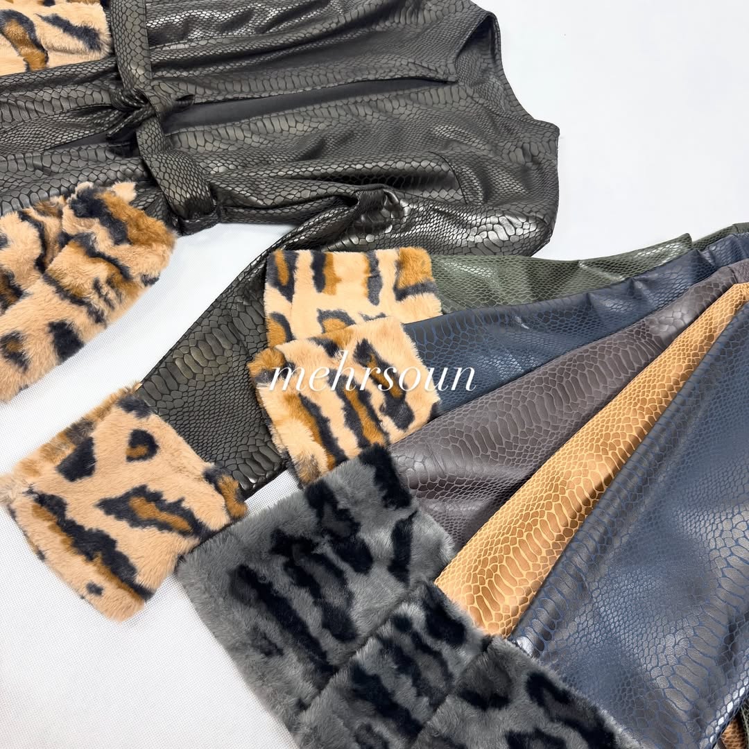 کت چرم زنانه طرح پوست ماری با خز پلنگی جلو باز کمربند دار پاییزی و یقه گرد