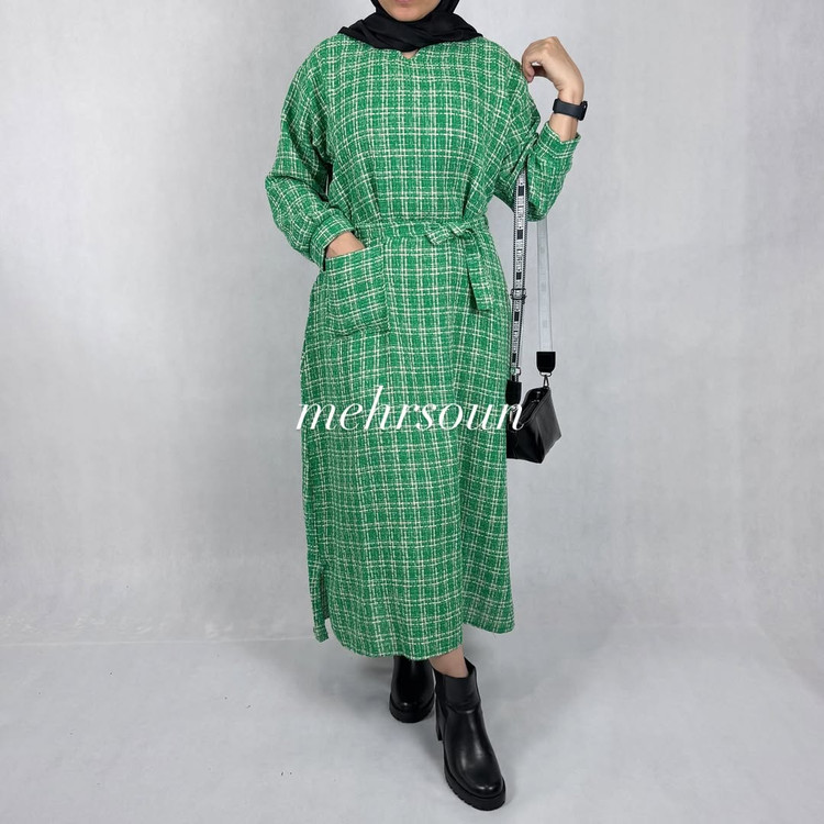 جزئیات : کنفی گرم،چاک ۱۰ سانتی بقل کار،کمربند دار،جیب تک روی لباس